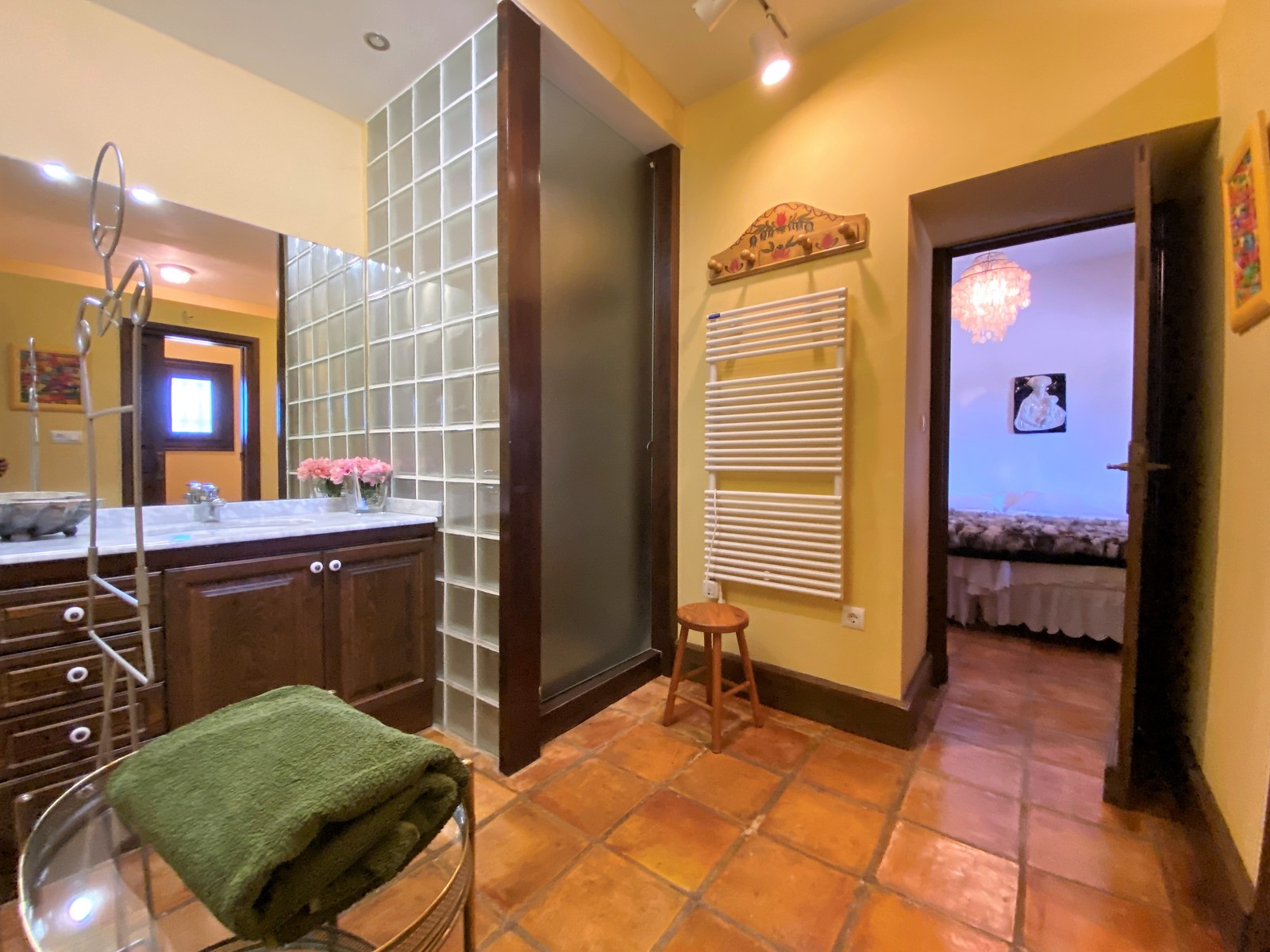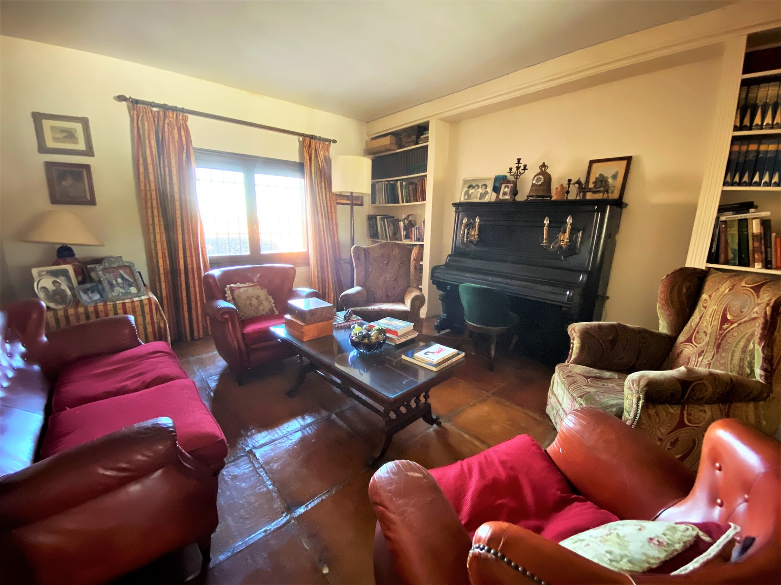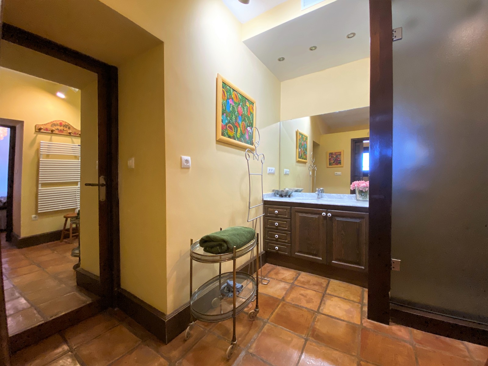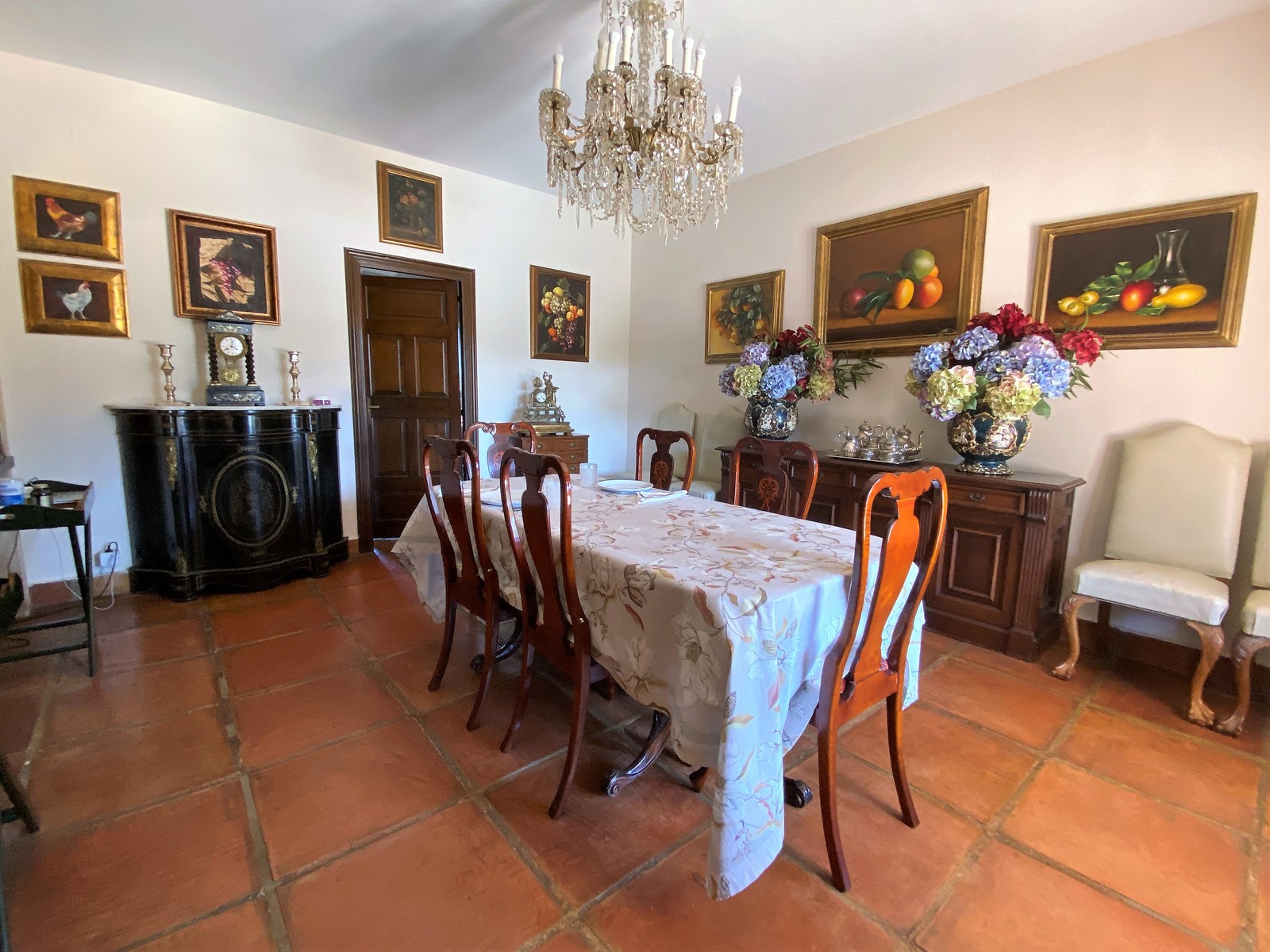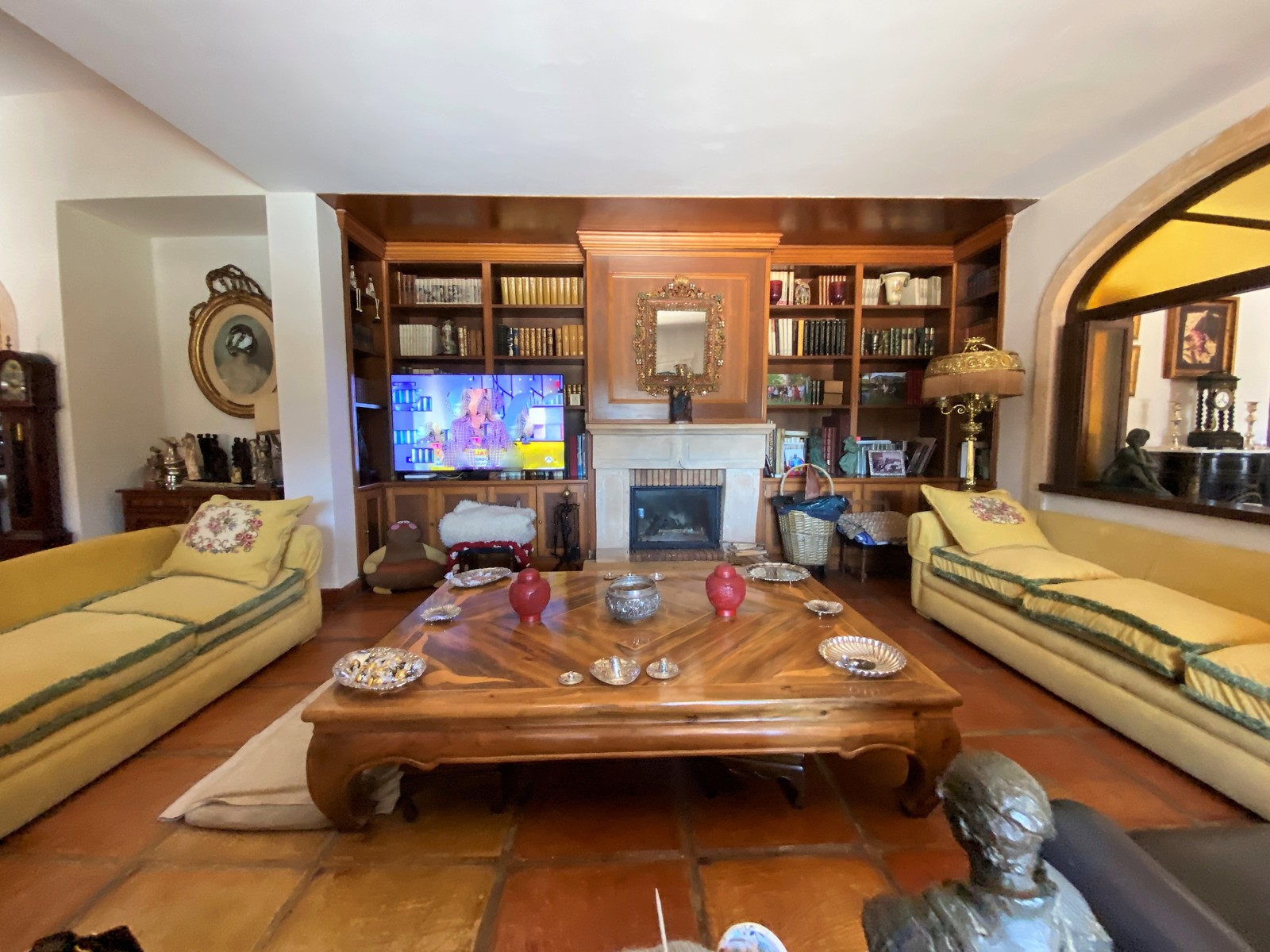 Durch die imposante, antike Eingangstür gelangt man in den großzügigen Eingangsbereich der Hauptwohnung. Er fasziniert mit seinen hohen Decken und vielen Gemälden. Von dort aus gelangt man weiter in die beiden geräumigen Wohnzimmer mit Kamin, Klavierzimmer und weiter in den offenen Essbereich mit Blick auf die Terrasse, den großen Pool und den schön angelegten Garten. Angrenzend ans Esszimmer befinden sich die Küche mit Vorratskammer, eine Waschküche und ein weiteres kleines Schafzimmer mit Duschbad (z.B. für Hausangestellte), welches derzeit als Atelier genutzt wird.