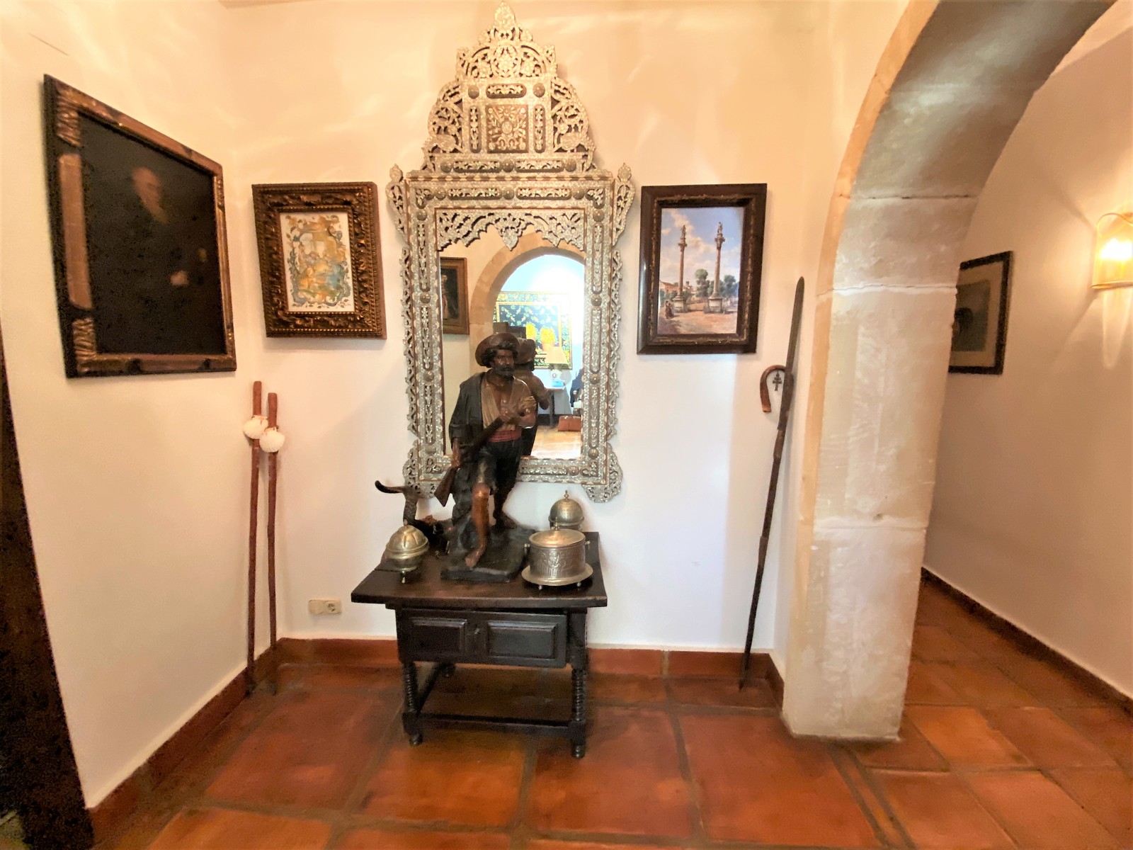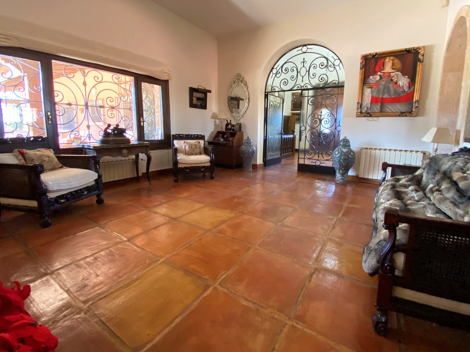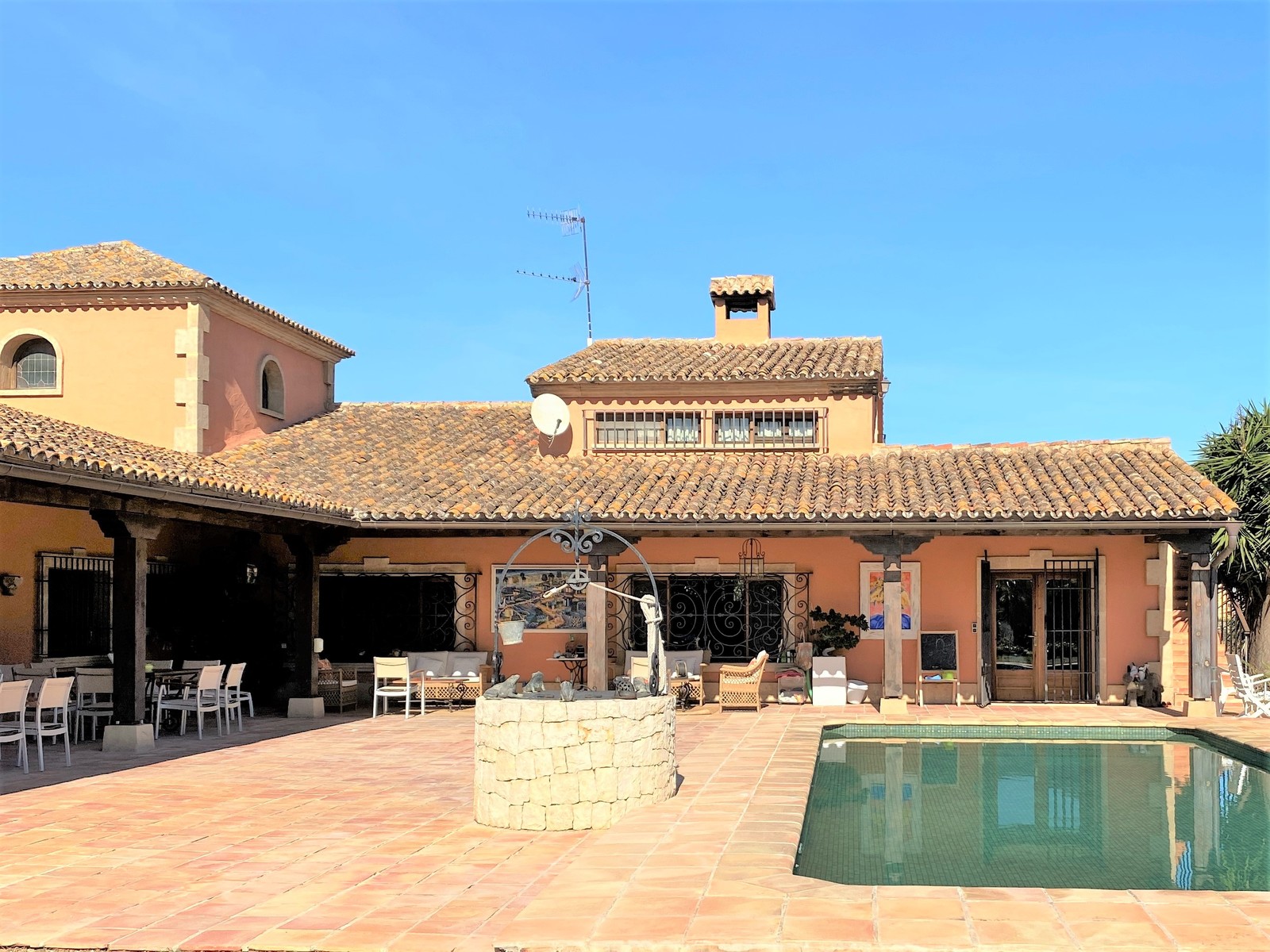 Terracotta-Böden einheitlich im gesamten Haus, Holzfenster mit Sicherheitsgittern, warm/ kalt Klimaanlage, Kamin im Wohnzimmer, diverse Einbauschränke, separates Dachgeschoss-Apartment und Wohnraum für Hausangestellte,stilvoll spanische Einbau-Küche, Keller mit Sauna und Weinkeller, großer Pool mit überdachten BBQ, Doppelgarage und Doppelcarport, diverse Terrassen, Sat-TV, Internet, Telefon, etc.