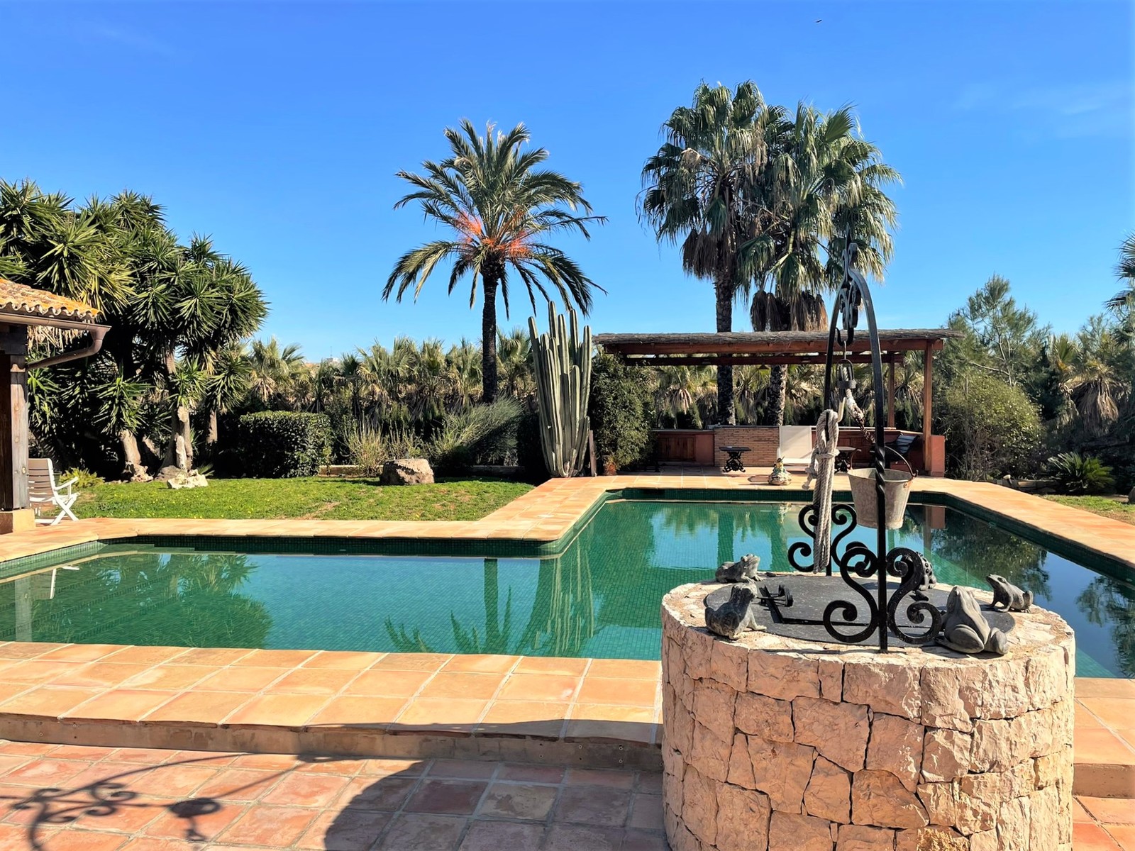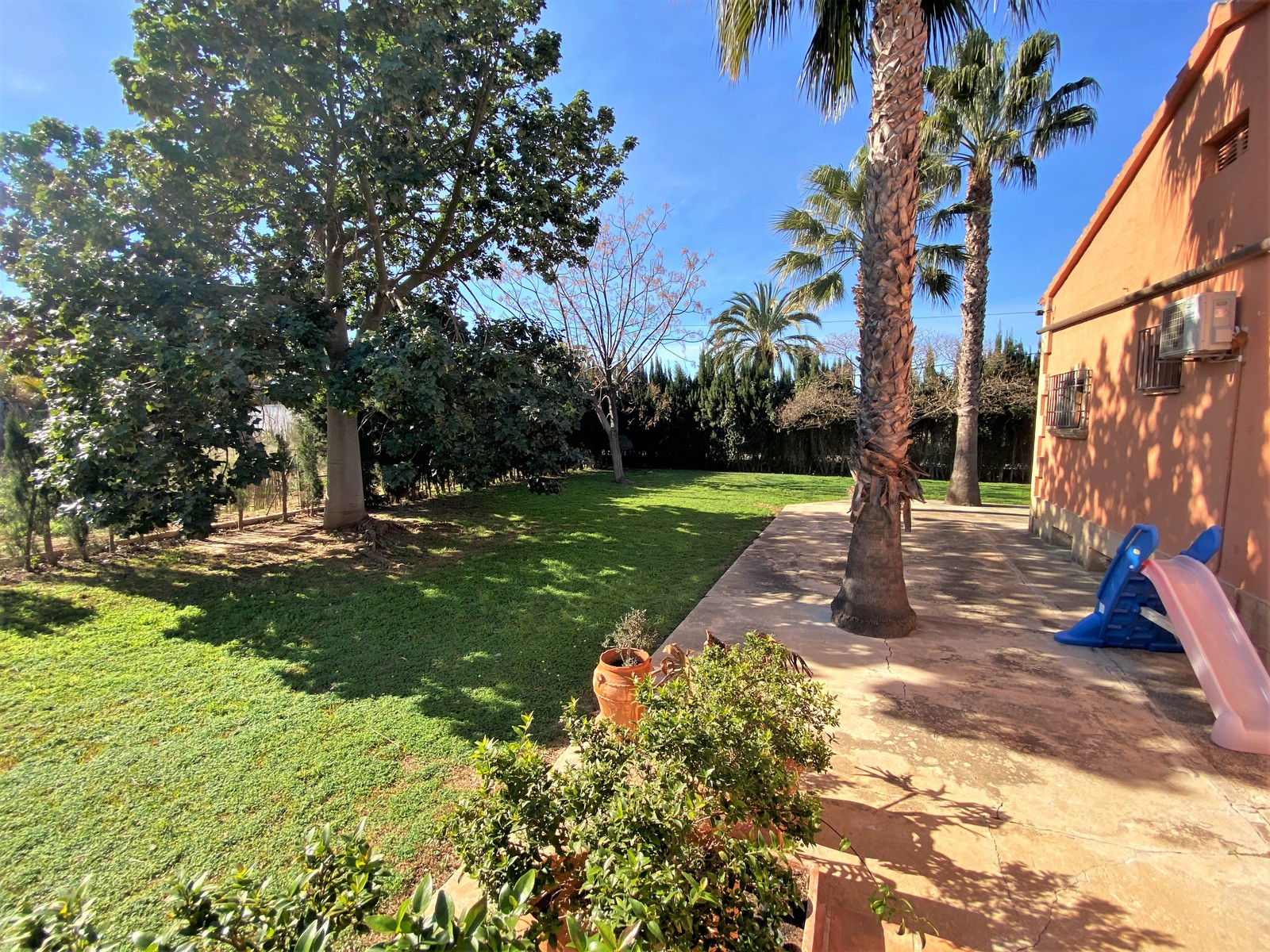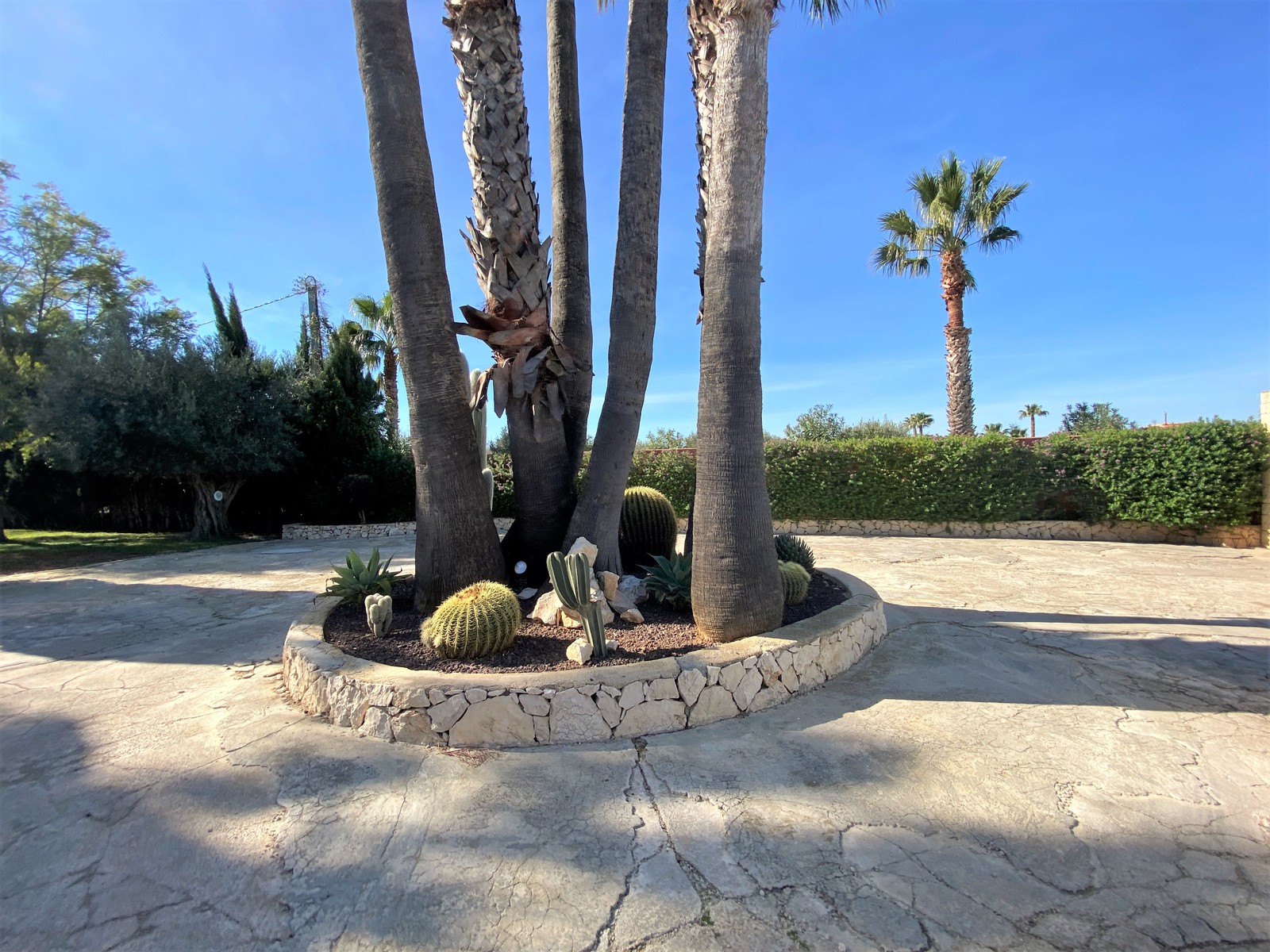 Der sehr gepflegte mediterrane Garten verwöhnt mit Palmen und bietet viel Platz für eine große Familie.