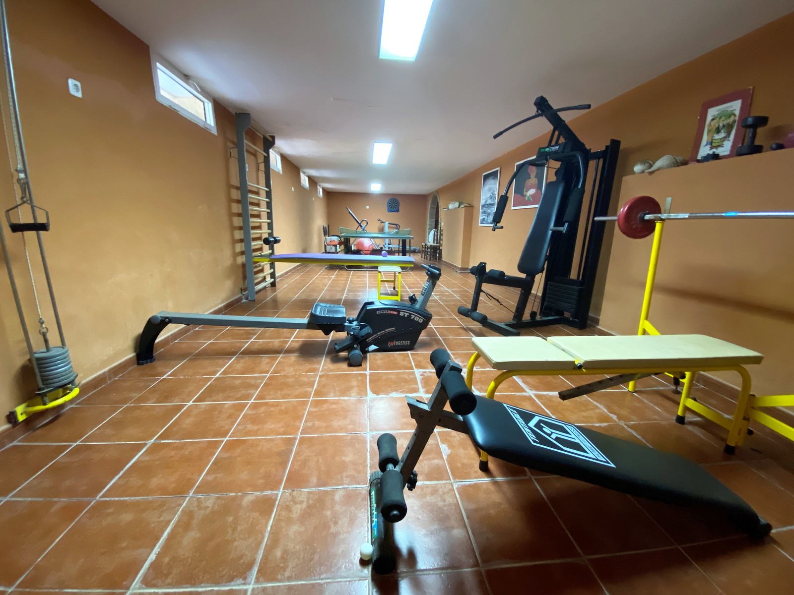 Eine Etage tiefer gibt es einen großen ausgebauten Keller, welcher viel Platz für Sportgeräte, Billard-Tisch und Hobbybereich bietet. Er verfügt außerdem über einen Weinkeller und eine kleine Bar, sowie eine geräumige Sauna mit angrenzender Dusche.