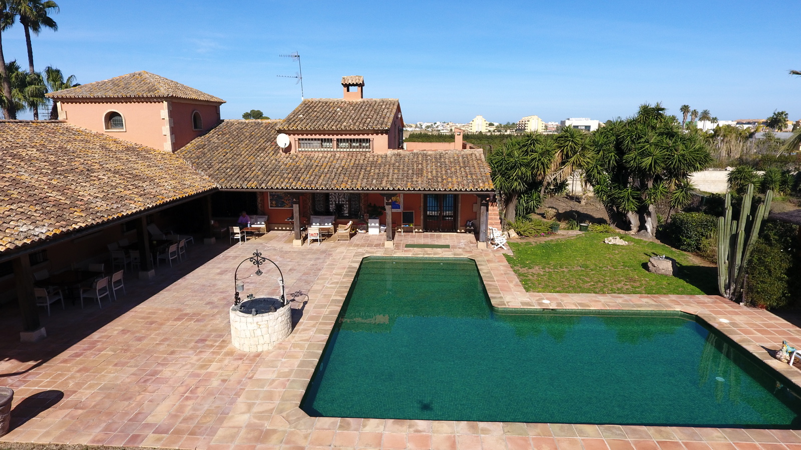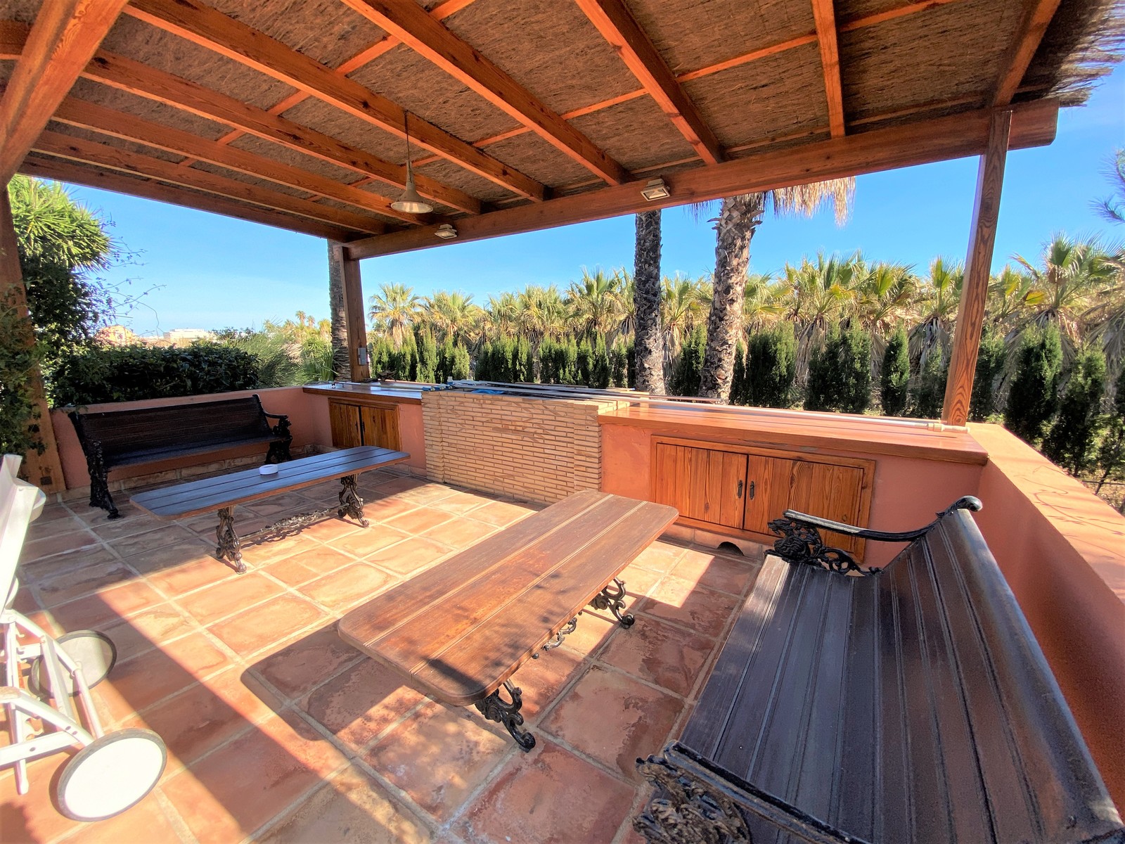 Das Haus verfügt über große Terrassen mit vielen Möglichkeiten für Sitzgelegenheiten und Ruhebereichen. Von dort aus sieht man den großen L-förmigen Pool. Dieser ist derzeit noch kindersicher von einem Zaun umrandet. Der überdachte, an den Pool angrenzende Barbecue-Bereich, lädt zu vielen schönen Grillfesten ein.