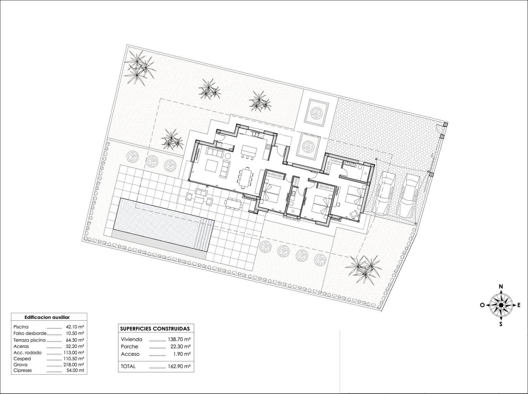 Modernes Villenprojekt zu verkaufen, CalpeDieses Projekt befindet sich in einer der Wohngegenden, die von allen Bewohnern von Calpe bevorzugt werden, da es in der Nähe des Stadtzentrums und der Strände liegt und gleichzeitig eine ruhige, aber sichere Gegend ist, da es sich am Rande des Stadtzentrums befindet.Die Immobilie wurde auf einer einzigen Etage geplant, was dieses Projekt praktisch und komfortabel macht.Das gesamte Grundstück ist eingezäunt und mit einer Zypressenhecke umgeben, was für Privatsphäre und eine angenehme Umgebung sorgt.Vom Haupteingang des Hauses gelangt man in eine Halle, von der aus man links in den Wohnbereich gelangt, der aus einem Wohnzimmer mit Esszimmer und offener Küche mit Kochinsel und einem Bereich für die Wäsche besteht. Vom Wohnzimmer aus haben wir Zugang zum Außenbereich, wo wir eine überdachte Veranda mit Grill und eine große Terrasse mit Schwimmbad von 40m2 haben.Auf der rechten Seite des Hauses befindet sich der Schlafbereich mit 3 Schlafzimmern: das Hauptschlafzimmer mit Ankleideraum und Bad und zwei weitere Schlafzimmer, die sich ein Bad teilen.Draußen gibt es einen Parkplatz mit einer Pergola in Form eines Segels für zwei Autos.Der angegebene Preis enthält keine Steuern und Kaufkosten / Das Angebot gilt vorbehaltlich von Irrtümern, Preisänderungen, Verfügbarkeit, Unterlassung und / oder Rücktritt vom Markt ohne Vorankündigung / Möbel und Inhalte nach individueller Vereinbarung und nicht nach den Fotos in der Präsentation
