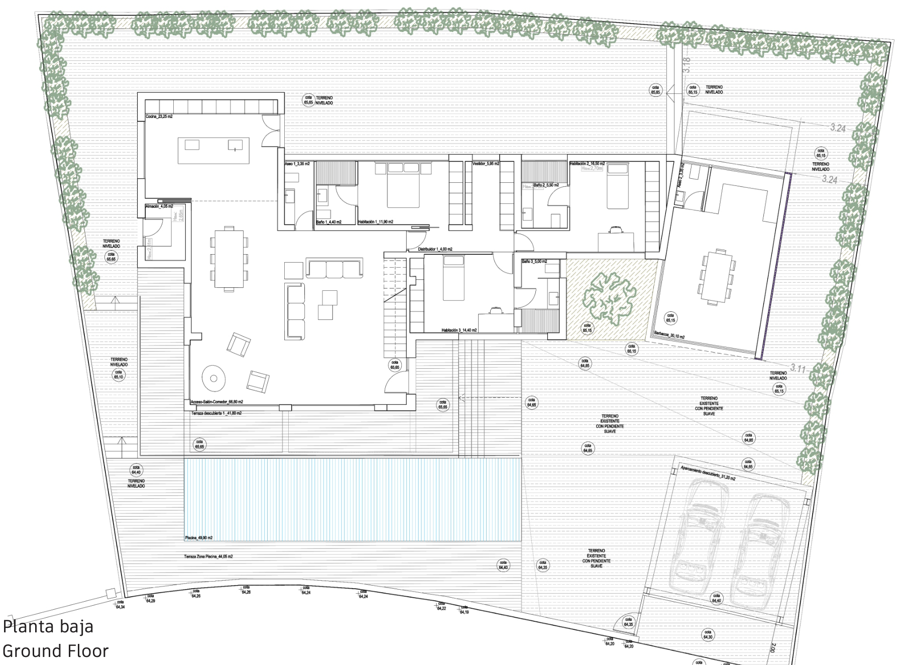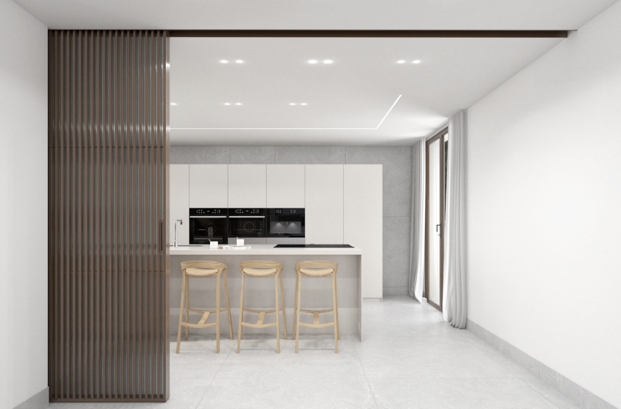 Im Erdgeschoss finden wir ein schönes, helles Wohnzimmer mit offener Bulthaup Küche und Hauswirtschaftsraum, ein separates Gäste-WC und 3 Schlafzimmer mit eigenem Bad. Eines davon mit begehbarem Kleiderschrank. Im ersten Stock finden wir das Hauptschlafzimmer mit eigenem Bad und begehbarem Ankleidezimmer und, als Sahnehäubchen, einen schönen Balkon mit Meerblick! Es besteht auch die Möglichkeit, einen 40 m2 großen Fitnessraum mit Bad einzurichten.