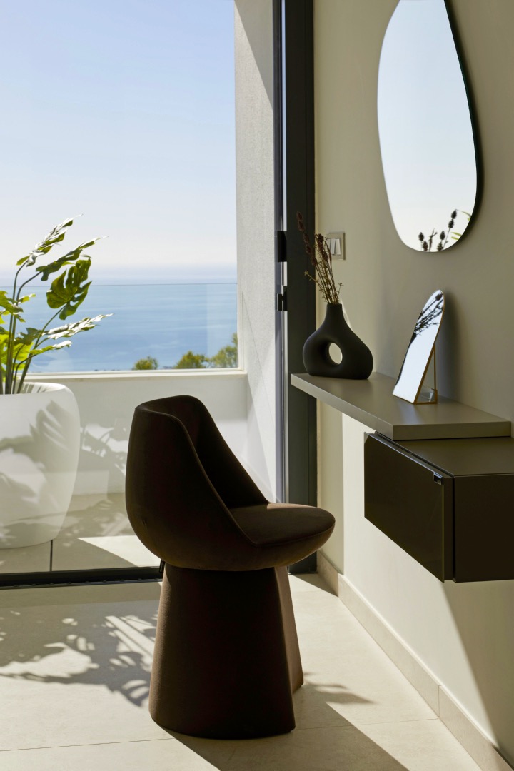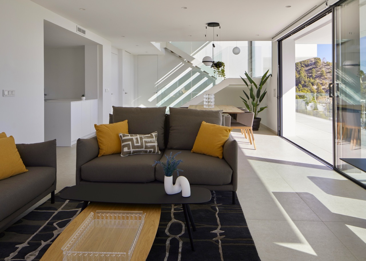 Das Hauptgeschoss ist in zwei Bereiche aufgeteilt, mit einem Flur und einer Treppe dazwischen. Auf der einen Seite befindet sich das vierte Schlafzimmer mit eigenem Bad, begehbarem Kleiderschrank und Zugang zur Hauptterrasse mit einem schönen Verandabereich. Auf der anderen Seite befinden sich ein Gäste-WC, eine offene Küche und ein Esszimmer mit einer schönen Mittelinsel. Hier können Sie für Freunde und Familie kochen und das Frühstück in der Morgensonne genießen! Das Esszimmer hat einen direkten Zugang zur Veranda, und das helle Wohnzimmer ist ideal, um abends zu entspannen. Dieses herrliche Anwesen verfügt über drei offene Räume, die durch das Mittelmeer in natürliches Licht getaucht werden. Noch besser ist, dass sie mit dem Außenbereich der Immobilie verbunden sind, mit mehreren Veranden, einer Außentoilette, einer großen Terrasse und einem Infinity-Pool!