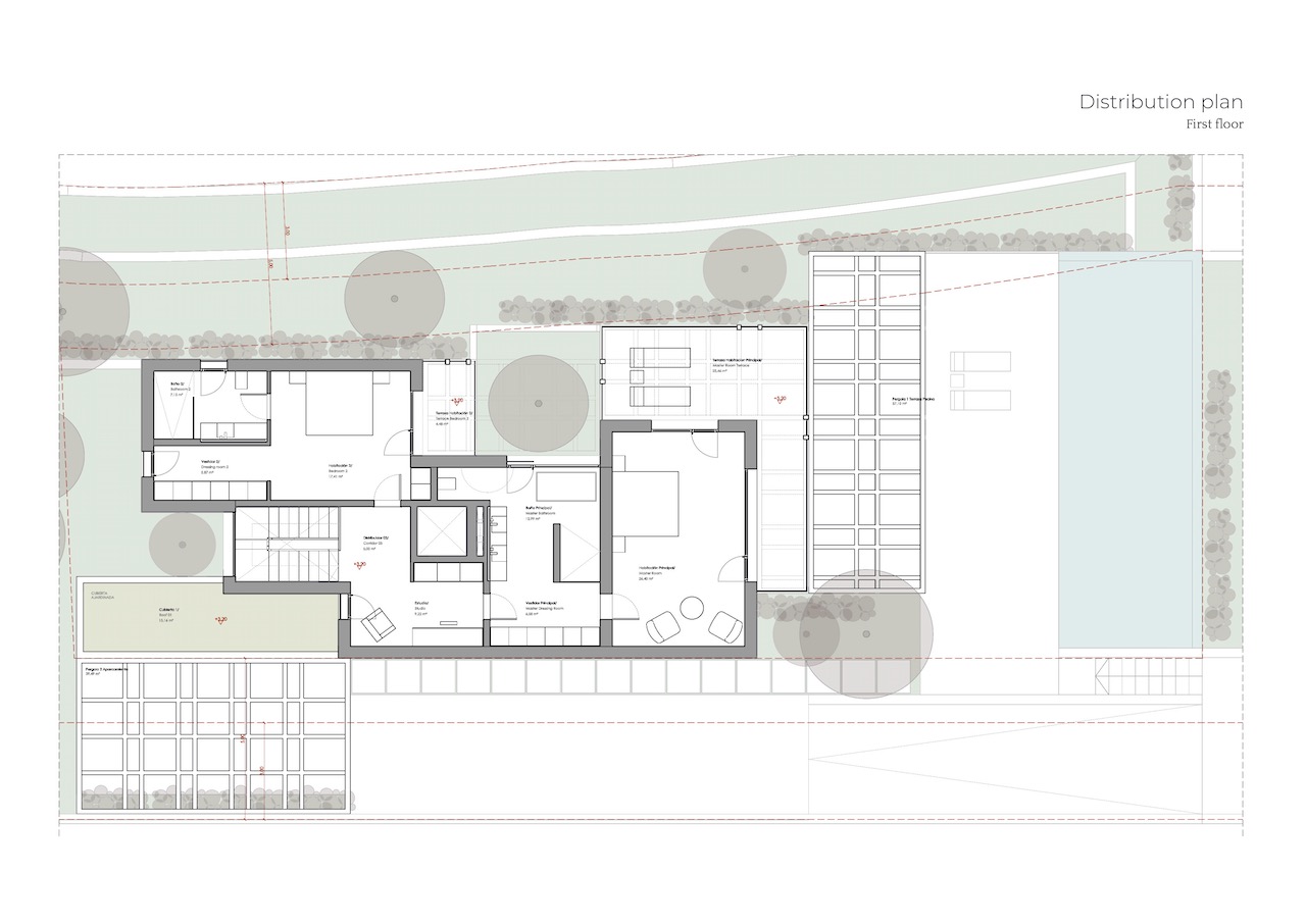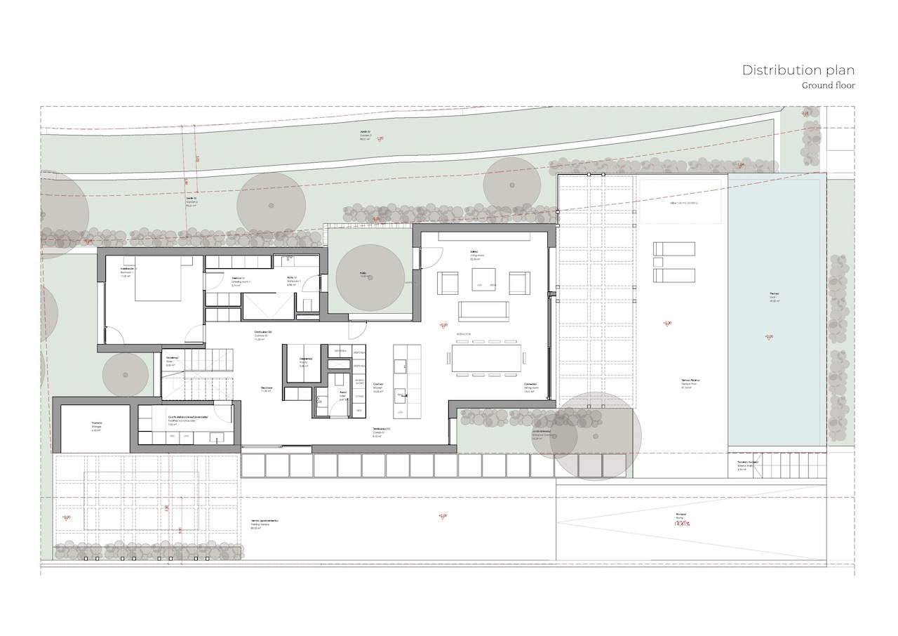 Im Erdgeschoss jeder Villa befinden sich ein geräumiges Wohnzimmer, ein Essbereich, eine Küche, ein Hauptschlafzimmer mit eigenem Bad und begehbarem Kleiderschrank sowie ein Gäste-WC. Der Wohnbereich geht nahtlos in den Außenbereich über, der über große überdachte Terrassen, einen privaten Pool und wunderschön angelegte mediterrane Gärten verfügt.