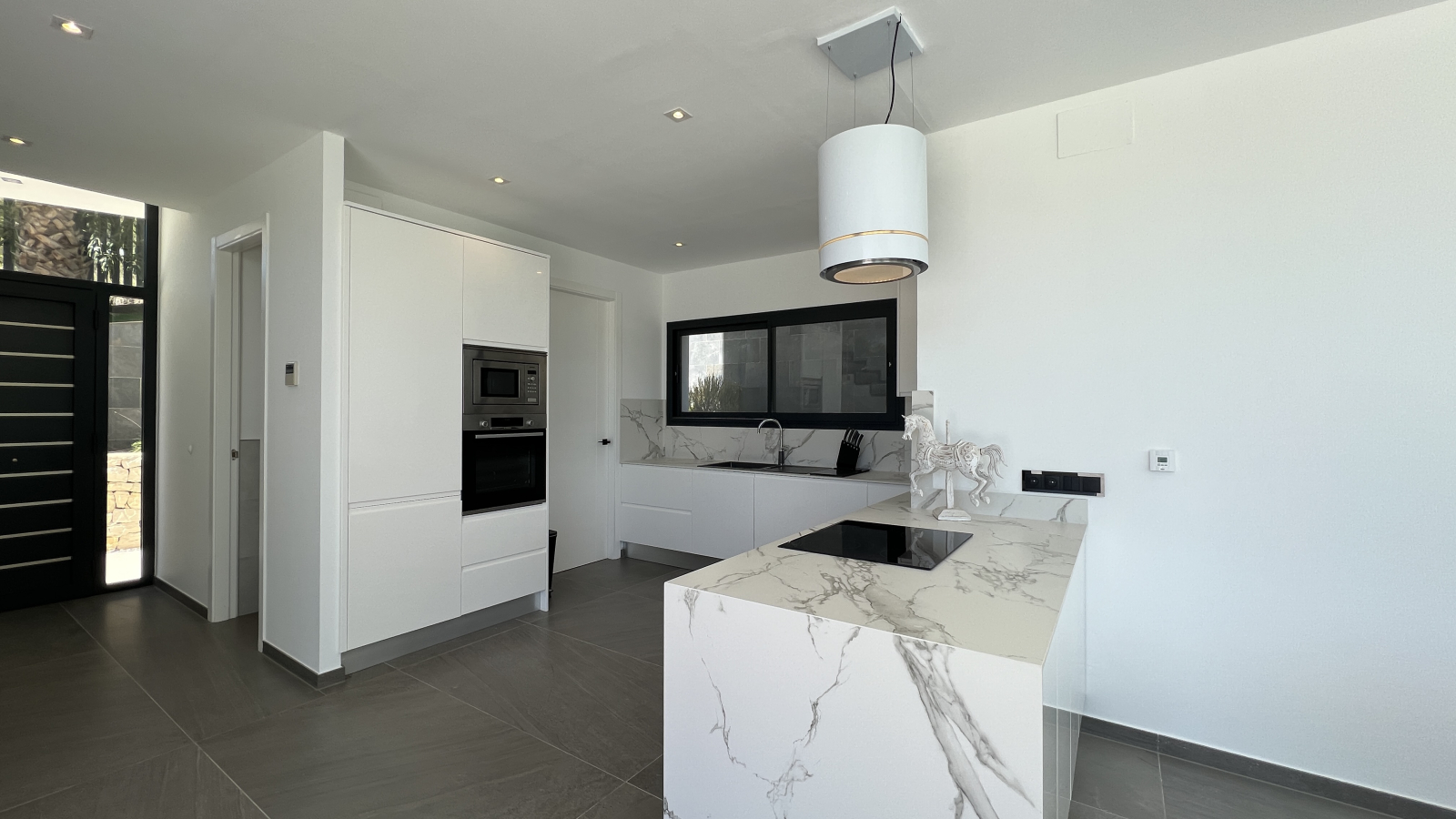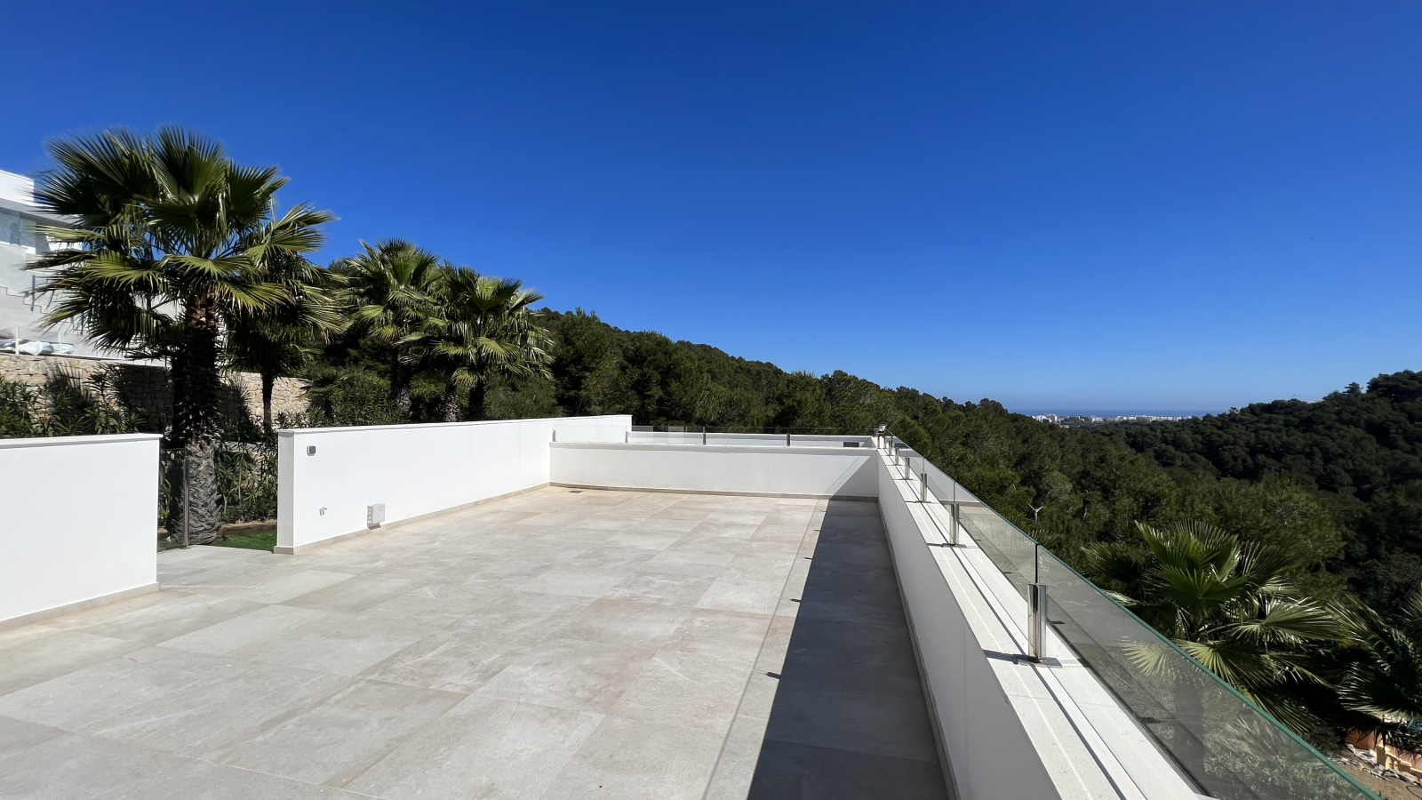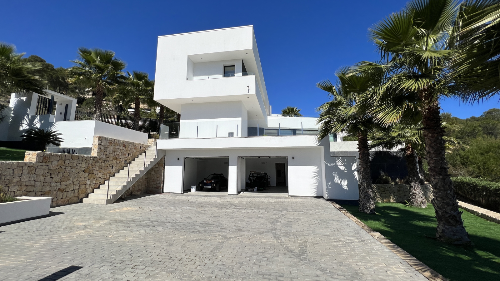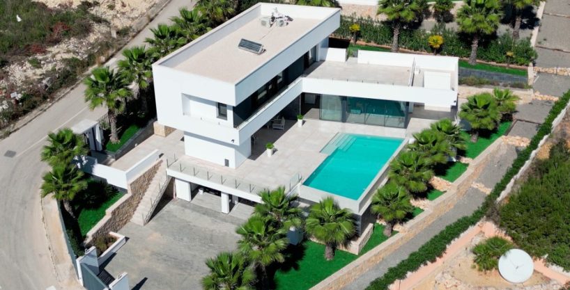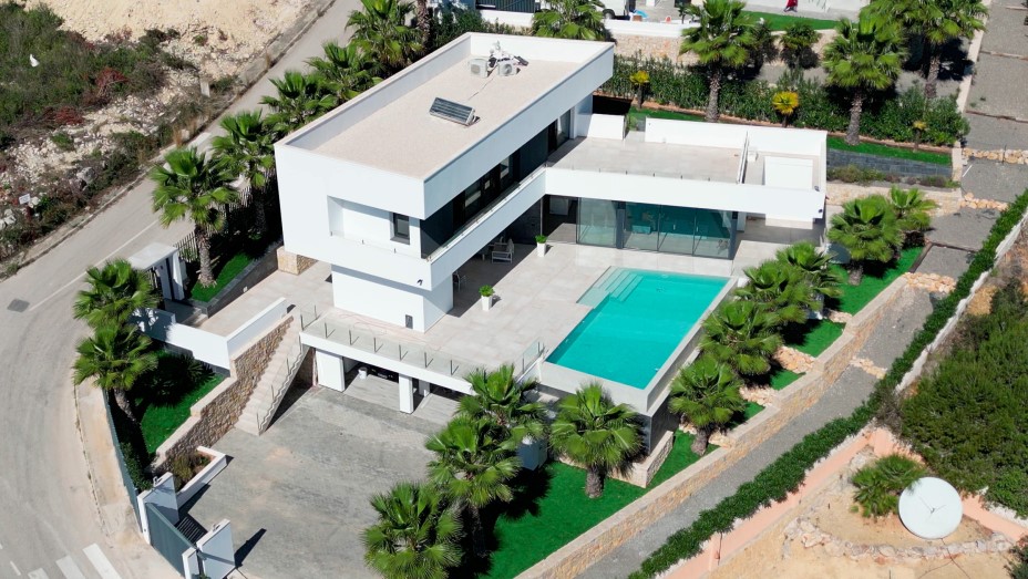 Die 2-stöckige Villa ist durchgehend hell und luftig, mit hohen Decken und klarem, zeitgenössischem Design, das den Raum wunderschön akzentuiert. Im Erdgeschoss des Hauses befindet sich das Wohn-Esszimmern mit offener Küche und Haushaltsraum und das Gäste WC. Dem Wohnzimmer sind, eine überdachte Terrasse und ein Bereich mit einer Pergola vorgelagert, um in den Sommermonaten einen schattigen Platz zu haben, von wo man den Blick auf das Mittelmeer und die Umgebung genießen kann. Ein Highlight ist der große Pool mit “infinity”- Effekt, breiter Einstiegstreppe und Unterwasserbeleuchtung. In der oberen Etage sind 3 Schlafzimmer, 2 davon mit Bad en-suite und Ausgang auf die Terrasse, ein weiteres Zimmer und ein Duschbad.