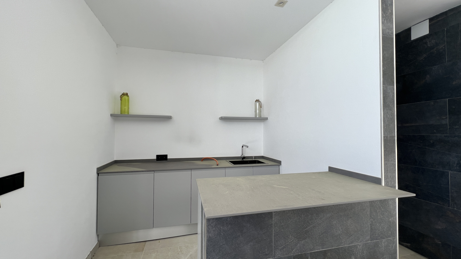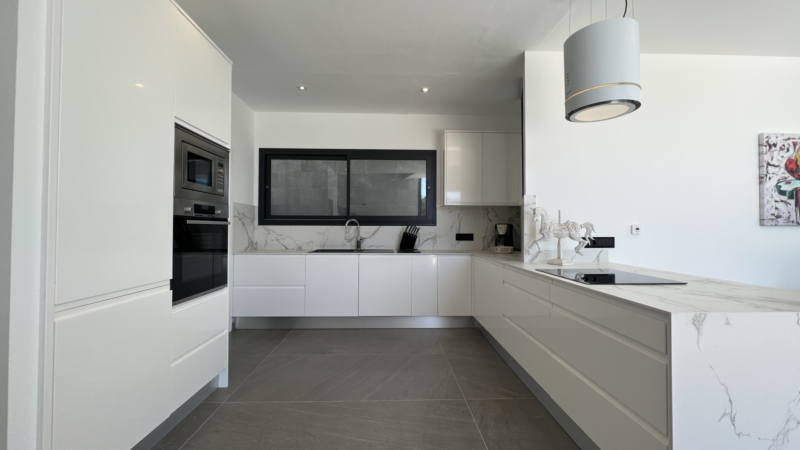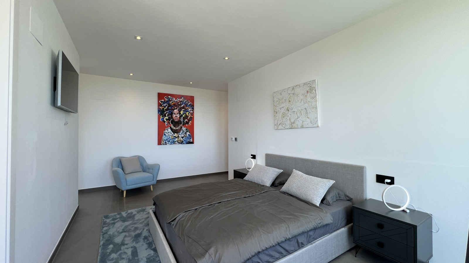 Die 2-stöckige Villa ist durchgehend hell und luftig, mit hohen Decken und klarem, zeitgenössischem Design, das den Raum wunderschön akzentuiert. Im Erdgeschoss des Hauses befindet sich das Wohn-Esszimmern mit offener Küche und Haushaltsraum und das Gäste WC. Dem Wohnzimmer sind, eine überdachte Terrasse und ein Bereich mit einer Pergola vorgelagert, um in den Sommermonaten einen schattigen Platz zu haben, von wo man den Blick auf das Mittelmeer und die Umgebung genießen kann. Ein Highlight ist der große Pool mit “infinity”- Effekt, breiter Einstiegstreppe und Unterwasserbeleuchtung. In der oberen Etage sind 3 Schlafzimmer, 2 davon mit Bad en-suite und Ausgang auf die Terrasse, ein weiteres Zimmer und ein Duschbad.