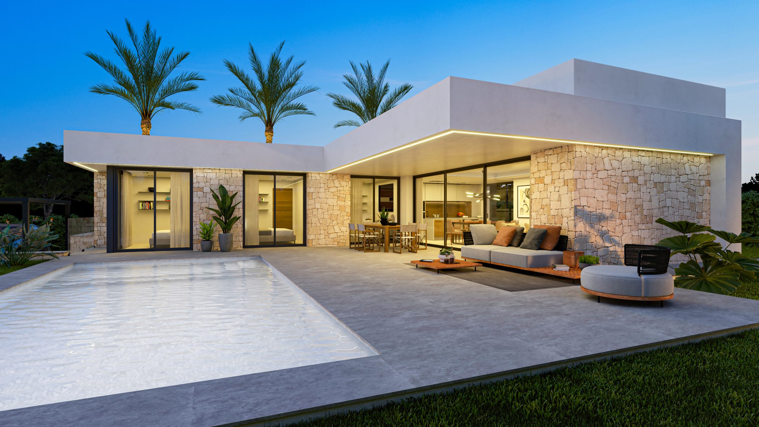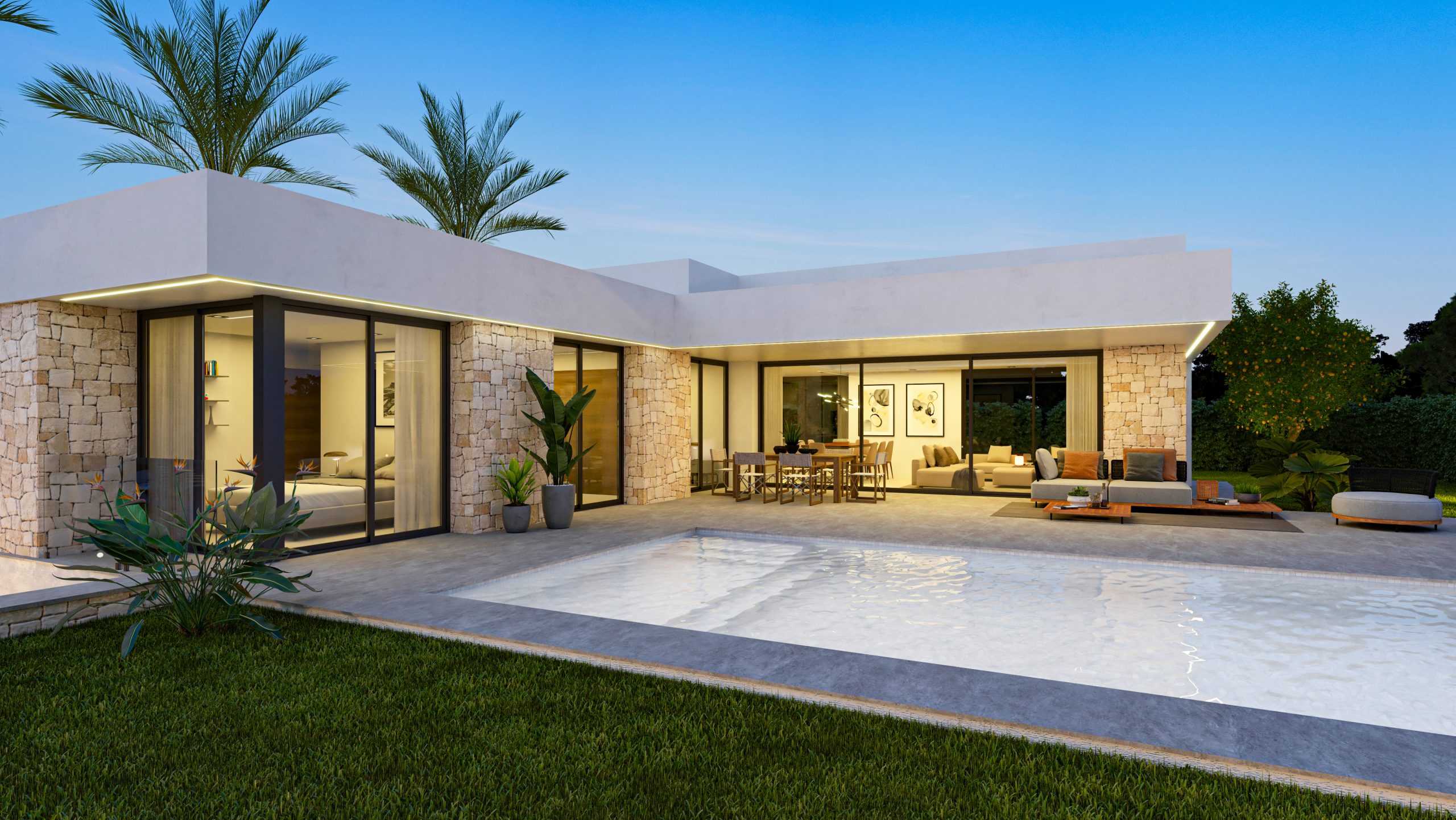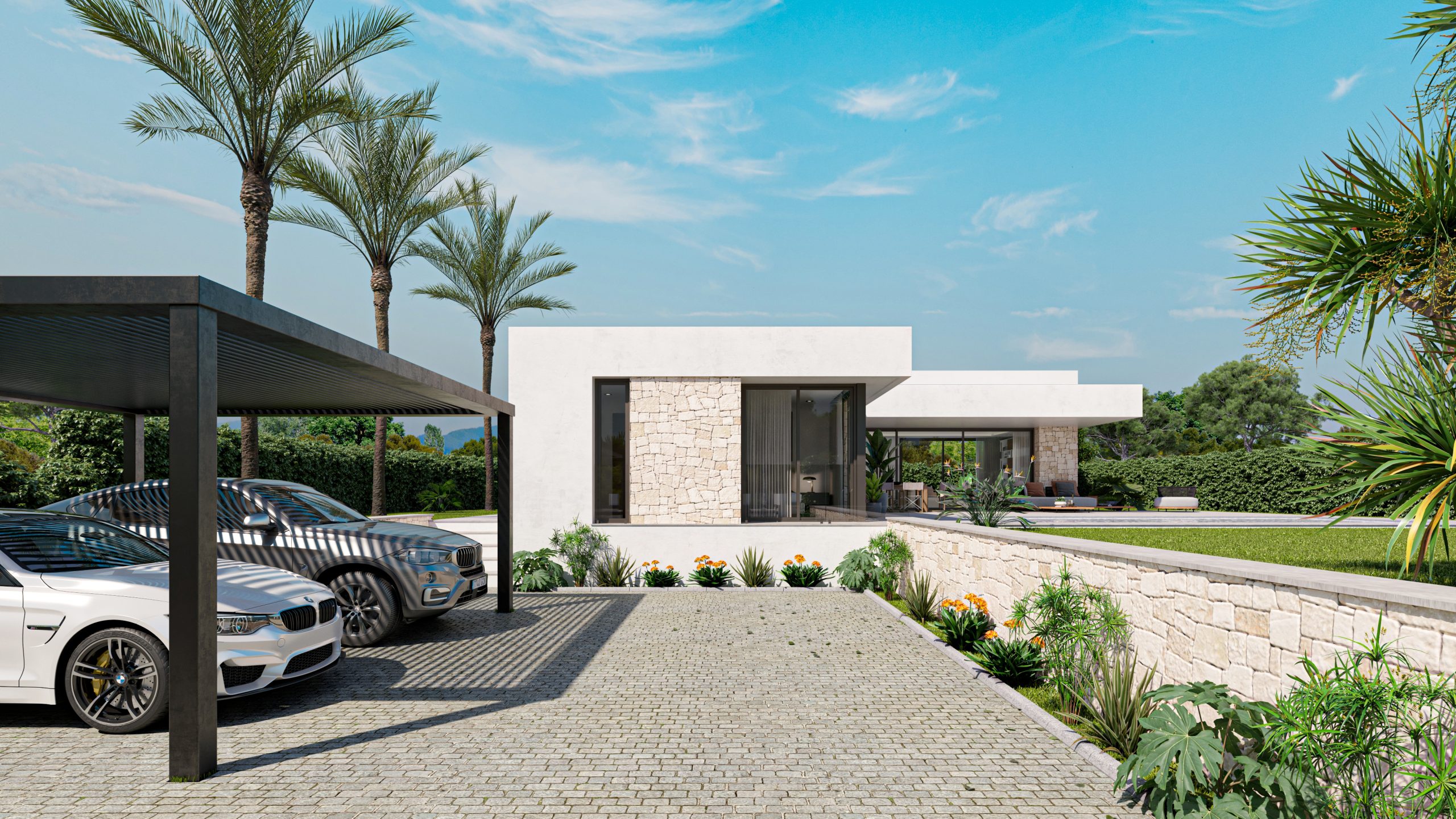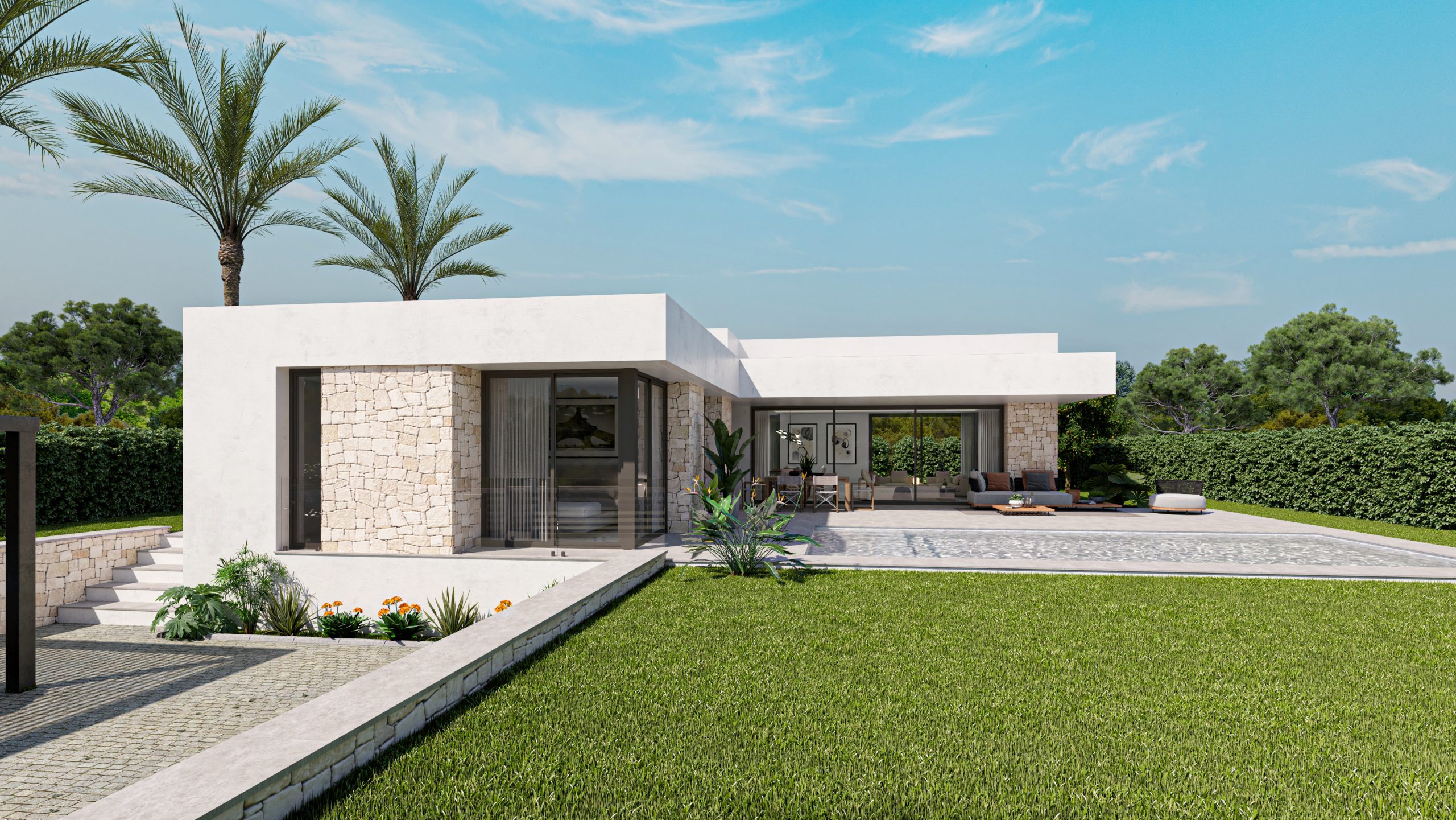 Villa Alcipe ist ein Haus im modernen Stil, das viel Licht hat und auf einer Etage organisiert ist, was das tägliche Leben erleichtert, da alle Räume perfekt miteinander verbunden sind. Der Haupteingang führt Sie direkt in ein geräumiges WohnEsszimmer, das sich durch große Fenster nach draußen öffnet und ein Gefühl von Geräumigkeit und Kontinuität mit der Terrasse und dem Pool vermittelt. Auf der rechten Seite des Wohnzimmers befindet sich eine offene Küche, die einen fließenden und sozialen Raum schafft, der sich perfekt für Unterhaltung oder Familienessen eignet.Die Schlafzimmer befinden sich strategisch günstig in einem privateren Flügel des Hauses, der Ruhe garantiert. Das Hauptschlafzimmer verfügt über einen eigenen Zugang zum Garten, ideal zum Entspannen am Ende des Tages. Die beiden weiteren Schlafzimmer öffnen sich ebenfalls nach draußen, so dass jederzeit natürliches Licht hereinfällt.Draußen bietet die Villa mehrere Bereiche, um die Sonne zu genießen, eine überdachte Terrasse für Momente der Entspannung und einen Swimmingpool, der sich harmonisch in das Design des Hauses einfügt. Die Gestaltung des Gartens ermöglicht es Ihnen, Grünflächen und schattige Plätze unter Palmen und Obstbäumen zu genießen und bietet ein perfektes Gleichgewicht zwischen dem Innenraum und der natürlichen Umgebung.Villa Alcipe verbindet modernes Design und Funktionalität in einer natürlichen Umgebung, die dazu gedacht ist, den mediterranen Lebensstil unter freiem Himmel zu genießen.