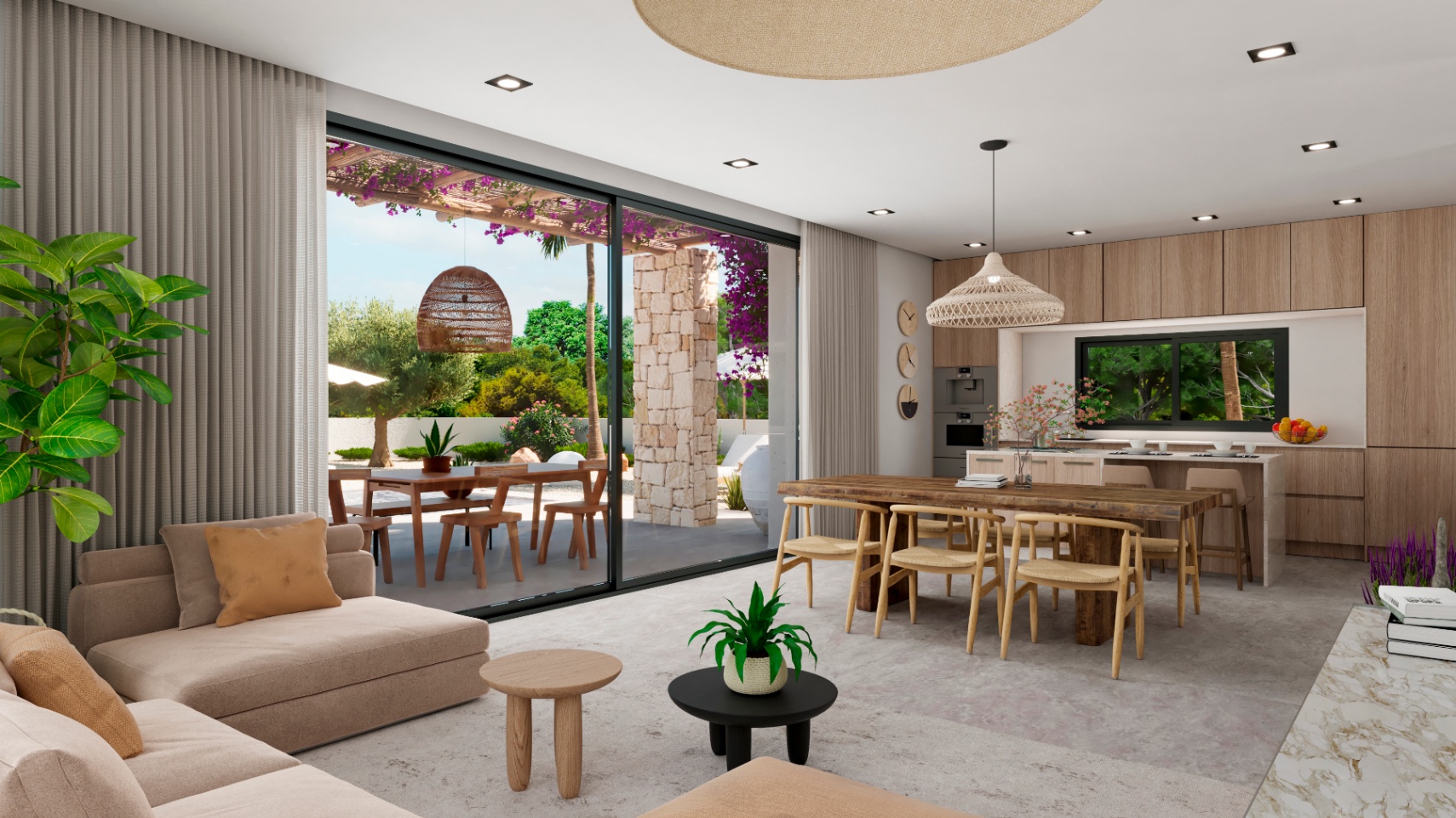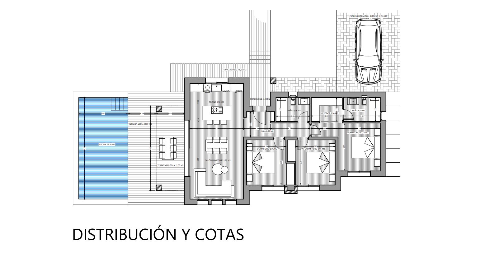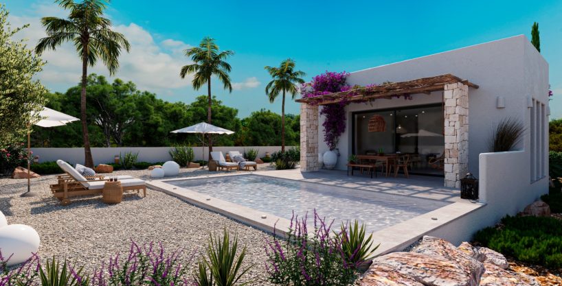 Die Villa Hebe zeichnet sich durch ihr vom ibizenkischen Stil inspiriertes Design aus, ein Konzept, das rustikale Eleganz mit zeitgenössischem Komfort verbindet. Diese einstöckige Villa befindet sich in der ruhigen Gegend von Marquesa V und ist perfekt für diejenigen, die einen Rückzugsort im Einklang mit der Natur suchen. Darüber hinaus verfügt das Projekt bereits über die notwendige Lizenz für seine Entwicklung, was die Ruhe und das Vertrauen der interessierten Parteien garantiert.Die offene Aufteilung fließt auf natürliche Weise zwischen Innen und Außen, mit einem geräumigen Wohnzimmer, das direkt mit der Terrasse und dem Pool verbunden ist. Die Terrasse bietet den idealen Raum, um das mediterrane Klima zu genießen, während die großen Fenster natürliches Licht in die Innenräume lassen und eine warme und einladende Atmosphäre schaffen.Die Verwendung natürlicher Materialien wie Stein und Holz erinnert an die Essenz des ibizenkischen Stils. Diese Details sorgen für einen rustikalen Touch, der perfekt durch moderne Annehmlichkeiten ergänzt wird und eine komfortable und elegante Umgebung schafft. Die Zimmer sind so gestaltet, dass sie Privatsphäre und Komfort bieten, mit direktem Zugang zu den Außenbereichen. Das Hauptschlafzimmer mit Zugang zur Terrasse ist ein intimes Refugium, das Sie zur Ruhe einlädt.Villa Hebe ist ideal für diejenigen, die Wert auf Ruhe legen und einen luxuriösen Lebensstil in Verbindung mit der Natur suchen. Die mediterrane Architektur und das sorgfältige Design machen es zu einer außergewöhnlichen Wahl, um eine exklusive und entspannende Umgebung zu genießen.